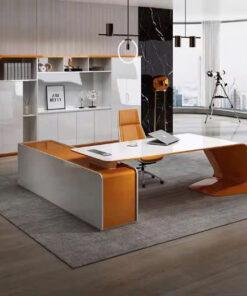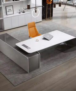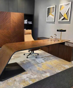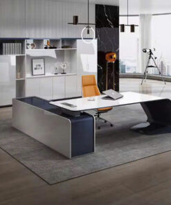 Bàn được đặt trong một văn phòng có thiết kế đồng bộ: hệ tủ kệ phía sau cũng sử dụng hình khối bo cong và tông màu xám/nâu trầm, kết hợp tường ốp đá Marble đen vân trắng làm điểm nhấn. Không gian có cửa sổ kính lớn, tận dụng ánh sáng tự nhiên, tăng vẻ hiện đại và thoáng đãng.