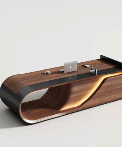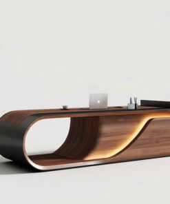 - Điểm nhấn: Hình dáng đường cong uốn lượn độc đáo, LED hắt sáng nghệ thuật, sự tương phản mạnh mẽ giữa gỗ trầm và màu đen.