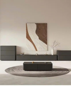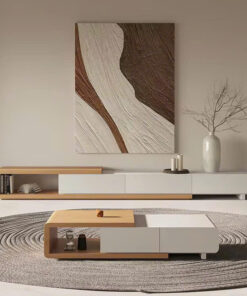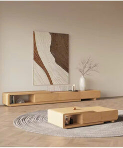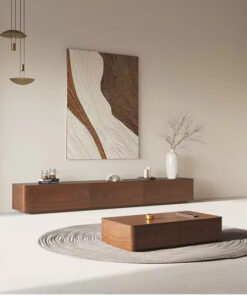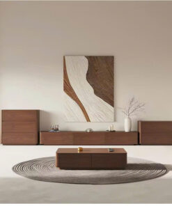 Kệ TV được thiết kế dạng treo tường hoặc đặt sàn thấp, phẳng, dài, tạo sự đồng nhất và tối đa hóa không gian trưng bày. Bàn Trà hình hộp chữ nhật thấp, bo góc tinh tế, có thể tích hợp ngăn kéo ẩn (hoặc thiết kế hộp rỗng) để tăng tính lưu trữ.