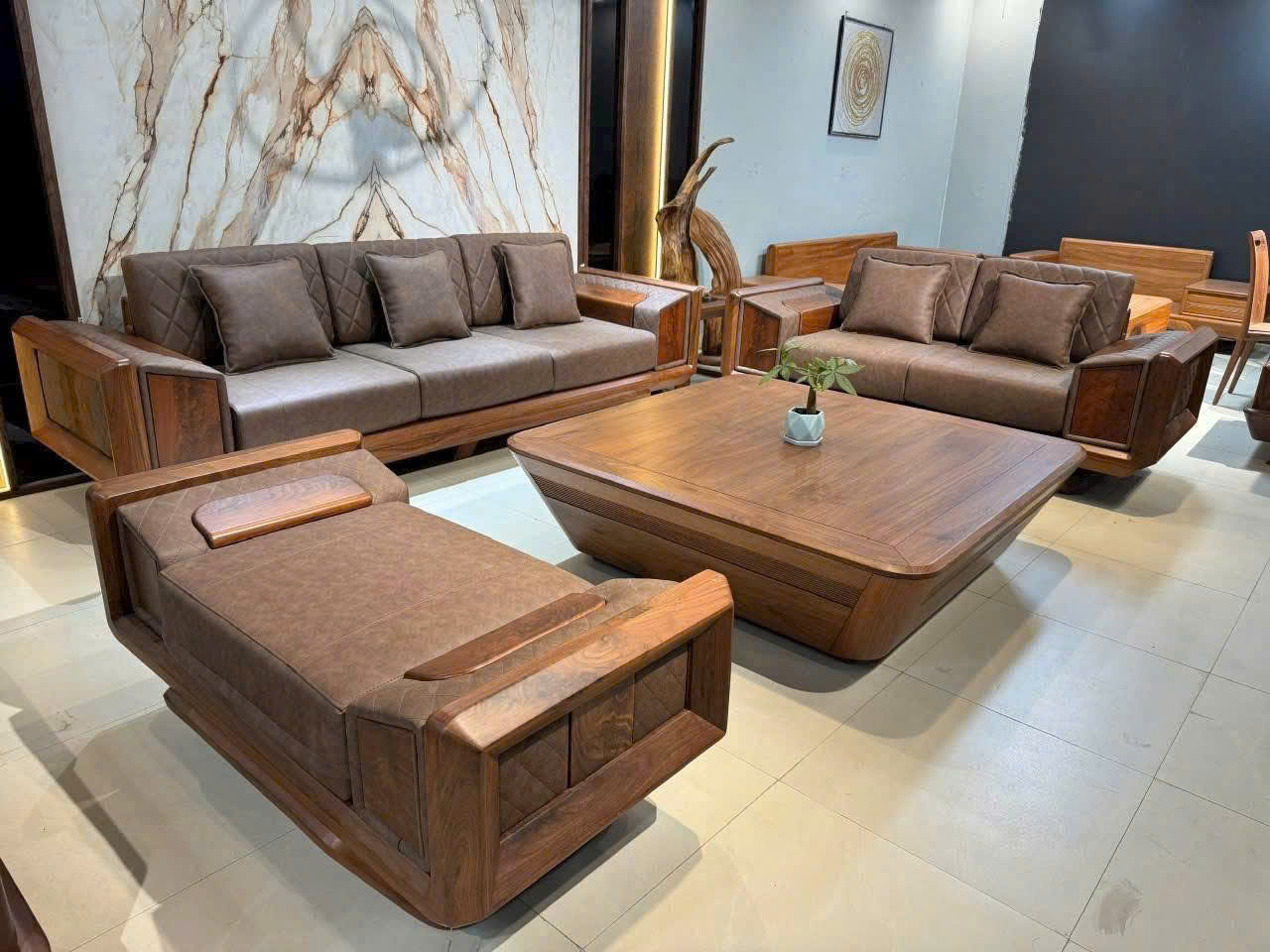 Phông nền phòng khách được nâng tầm nhờ mảng tường ốp đá Marble lớn vân màu nâu/vàng đất ấn tượng (tương tự như vân gỗ), tạo sự kết nối hài hòa giữa chất liệu gỗ và đá. Bộ sản phẩm này rất phù hợp cho các không gian phòng khách lớn trong biệt thự hoặc nhà phố yêu cầu tính thẩm mỹ cao và sự phô diễn quyền lực của chất liệu tự nhiên.