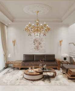 Bộ sofa gỗ tự nhiên và bàn trà tròn phong cách bán cổ điển