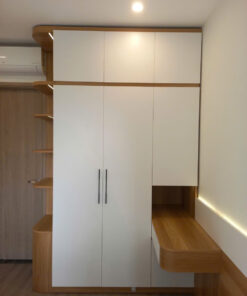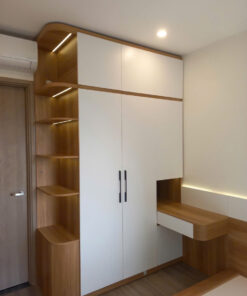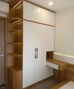 Bàn Trang Điểm/Làm Việc: Phía bên phải tủ được thiết kế một khoảng trống tích hợp bàn nổi (floating desk), sử dụng chất liệu gỗ đồng bộ với khung tủ. Khu vực này được trang bị LED hắt sáng, rất tiện lợi cho việc trang điểm hoặc làm việc.