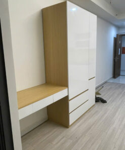 Phần Bàn Làm Việc/Học Tập: Bàn được thiết kế treo tường (floating desk) liền khối với tủ quần áo. Tông màu gỗ tự nhiên của bàn tương phản với màu trắng của tủ, tạo điểm nhấn thị giác.